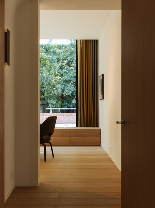 De wachtruimte aan de balie werd gezellig gemaakt met Chisel Lounge Chairs van HAY in op waterbasis gelakt notenhout. Deze eigentijdse stoelen werden ontworpen door de Noorse designer Andreas Bergsaker. Eén stoel werd bekleed met schapenvacht, de andere bleef onbekleed. De naam, afgeleid van het traditionele timmerwerktuig de beitel, weerspiegelt het idee om een massief houten stoel te creëren met een onderscheidend tijdloos silhouet. De zachte, organisch gevormde zitting en rugleuning zijn met zorg ontworpen, met optimaal vakmanschap en ergonomie als uitgangspunten. De unieke schuine poten met afgeschuinde randen weerspiegelen subtiel de verwijzing naar de beitel. De Ethnicraft Geometric bijzettafel in teak van Alain Van Havre past hier wonderwel bij. Geometrische vormen kruisen elkaar en creëren interactie. Deze bijzettafel ziet er vanuit iedere invalshoek helemaal anders uit.