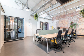 De bureaustoelen zijn van Interstuhl. Het zijn zwarte uiterst comfortabele bureaustoelen met 6-traps regelbare synchroontechniek, voorzien van universele wielen, met een hoge rugleuning, NPR 4D-armleggers en een comfort zitting in geel, roze, muntgroen en lichtblauw. De zitdiepte en de lendensteun kunnen individueel aangepast worden.