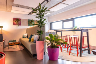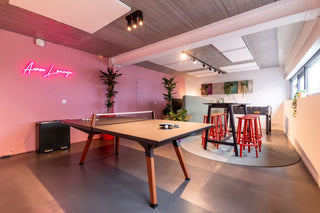 Een oude keuken werd omgetoverd tot nieuwe superleuke en hippe lounge en gameroom met PlayStationhoek en pingpongtafel van het Franse merk Cornilleau. De PlayStation rust op een handige ladenkast van Narbutas. Een prachtige olijfkleurige treinbank, die ook handig dient als room devider, zorgt voor comfortabel spelplezier. Ze is voorzien van knusse veelkleurige ‘Herringbone’ kussentjes van Vitra. Aan de andere kant van de treinbank staat een hoge bartafel met Fenix bovenblad en een houten onderstel in zwarte gekleurde es van Narbutas, omgeven door zes opvallende Revolver barkrukken van HAY in lavarood. Deze ontspanningsruimte werd ook voorzien van een groot cirkelvormig ‘Circle’ en keivormig ‘Pebble’ tapijt van Object Carpet. Op dit laatste staat een handig Tray Table M tafeltje van HAY in de kleur ‘Peppermint’. De handige gele Giravolta vloerlamp van Pedrali zorgt voor gezellig licht. Wandpanelen voor planten in vier verschillende kleuren (Ivory, Plum, Pine en Plain) van Götessons Design Group, zorgen voor een betere akoestiek in de ruimte.