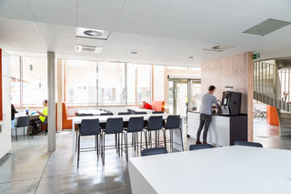 De kantineruimte werd ingericht met de stapelbare polypropyleen bar- en eetkamerstoelen Paris van het Belgische merk Perfecta, in de kleur antraciet. Deze stoel met vier poten is aan te passen aan de wensen van de klant: zowel de zitkuip als de poten kunnen besteld worden in diverse kleuren. We plaatsten in deze ruimte ook op maat gemaakte banketten, bekleed met de waterdichte en UV-bestendige stof Silvertex, in de kleur Mandarin.