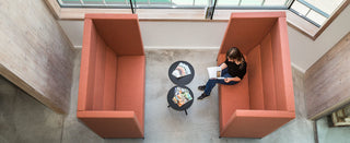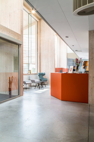Een beetje verderop is een hoekje met meer privacy ingericht dankzij de twee ‘hoog’ zitelementen, rond twee ronde zwarte Triple salontafeltjes. Dankzij het slimme design van het zitmeubel wordt perifeer zicht belemmerd en omgevingsgeluid geweerd. Het driepotig onderstel is in antraciet en de stoffering is oranje.