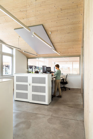 De witte akoestische schuifdeurkasten met ‘softclose’ systeem zijn niet alleen handig in gebruik, ze hebben ook een akoestische achterwand. Bovendien zijn de schuifdeuren gemaakt van geluidsabsorberend akoestisch vilt. Ze dempen de omgevingsgeluiden in het kantoor en zorgen voor een rustige en productieve werkomgeving. Ze bevatten ook een handig frame voor hangmappen.