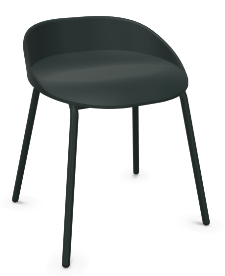 Zowel de zitting als het frame zijn uitgevoerd in donkergroen (RAL 6012) met een semi-matte afwerking, wat zorgt voor een stijlvol monotoon kleurstatement. De subtiele rondingen en ergonomische vormgeving dragen bij aan een comfortabele zitervaring, terwijl het minimalistische design zich moeiteloos aanpast aan diverse interieurstijlen.