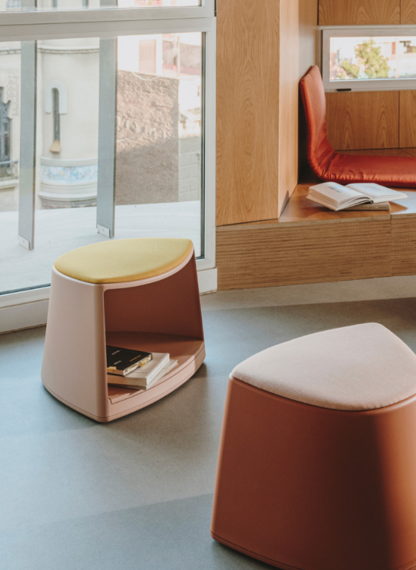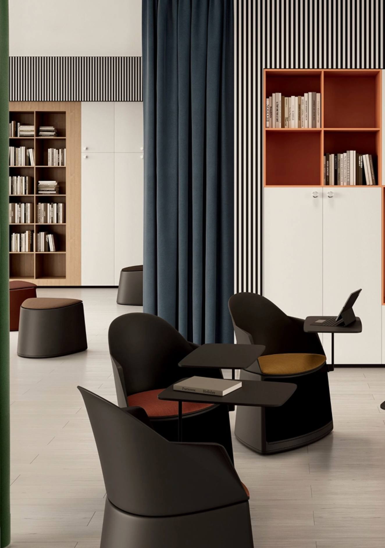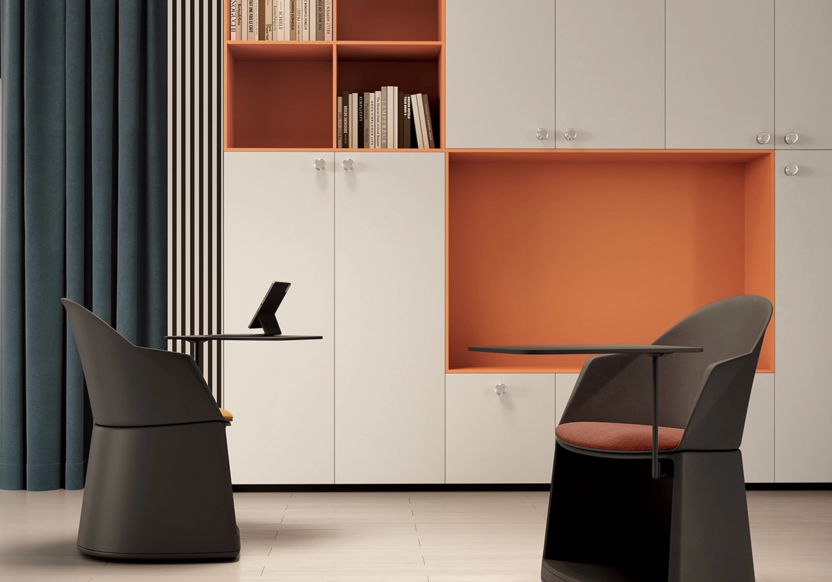 Cila Go is volledig configureerbaar: van eenvoudige poef tot stoel of fauteuil met schrijftablet en opbergfunctie, passend bij elke onderwijs- of samenwerkingsruimte.