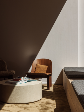 De wachtruimte aan de balie werd gezellig gemaakt met Chisel Lounge Chairs van HAY in op waterbasis gelakt notenhout. Deze eigentijdse stoelen werden ontworpen door de Noorse designer Andreas Bergsaker. Eén stoel werd bekleed met schapenvacht, de andere bleef onbekleed. De naam, afgeleid van het traditionele timmerwerktuig de beitel, weerspiegelt het idee om een massief houten stoel te creëren met een onderscheidend tijdloos silhouet. De zachte, organisch gevormde zitting en rugleuning zijn met zorg ontworpen, met optimaal vakmanschap en ergonomie als uitgangspunten. De unieke schuine poten met afgeschuinde randen weerspiegelen subtiel de verwijzing naar de beitel. De Ethnicraft Geometric bijzettafel in teak van Alain Van Havre past hier wonderwel bij. Geometrische vormen kruisen elkaar en creëren interactie. Deze bijzettafel ziet er vanuit iedere invalshoek helemaal anders uit.