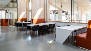 De kantineruimte werd ingericht met de stapelbare polypropyleen bar- en eetkamerstoelen Paris van het Belgische merk Perfecta, in de kleur antraciet. Deze stoel met vier poten is aan te passen aan de wensen van de klant: zowel de zitkuip als de poten kunnen besteld worden in diverse kleuren. We plaatsten in deze ruimte ook op maat gemaakte banketten, bekleed met de waterdichte en UV-bestendige stof Silvertex, in de kleur Mandarin.