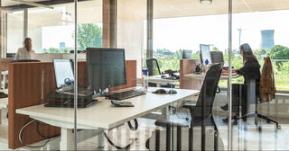 Voor wat betreft de bureaus leverde Buro International diverse witte BIVO Duo Bench bureaus. Deze zijn elektrisch in hoogte verstelbaar. Het zijn hoogkwalitatieve en stabiele zitstabureaus voorzien van akoestische scheidingswanden in oranje tinten. Als bureaustoel werd de zwarte ergonomische Every van Interstuhl gekozen. Deze comfortabele draaistoel op wieltjes en met armsteunen heeft een rugleuning met netbespanning en is voorzien van de autolifttechniek. De lendensteun en de zitdiepte zijn verstelbaar. We leverden ook de zwarte Capisco Puls 8020 bureaustoel van HÅG. Deze combineert hip design met ergonomische efficiëntie. Met zijn lichte kunststof ontwerp en extra kussentje op de zitting biedt deze stoel comfort en ondersteuning bij elke werkhouding – van zitten tot staan. Perfect dus voor deze moderne werkplek, die flexibiliteit en stijl vereist.