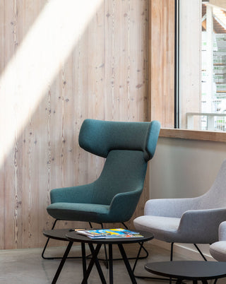 Een beetje verderop is een hoekje met meer privacy ingericht dankzij de twee ‘hoog’ zitelementen, rond twee ronde zwarte Triple salontafeltjes. Dankzij het slimme design van het zitmeubel wordt perifeer zicht belemmerd en omgevingsgeluid geweerd. Het driepotig onderstel is in antraciet en de stoffering is oranje.